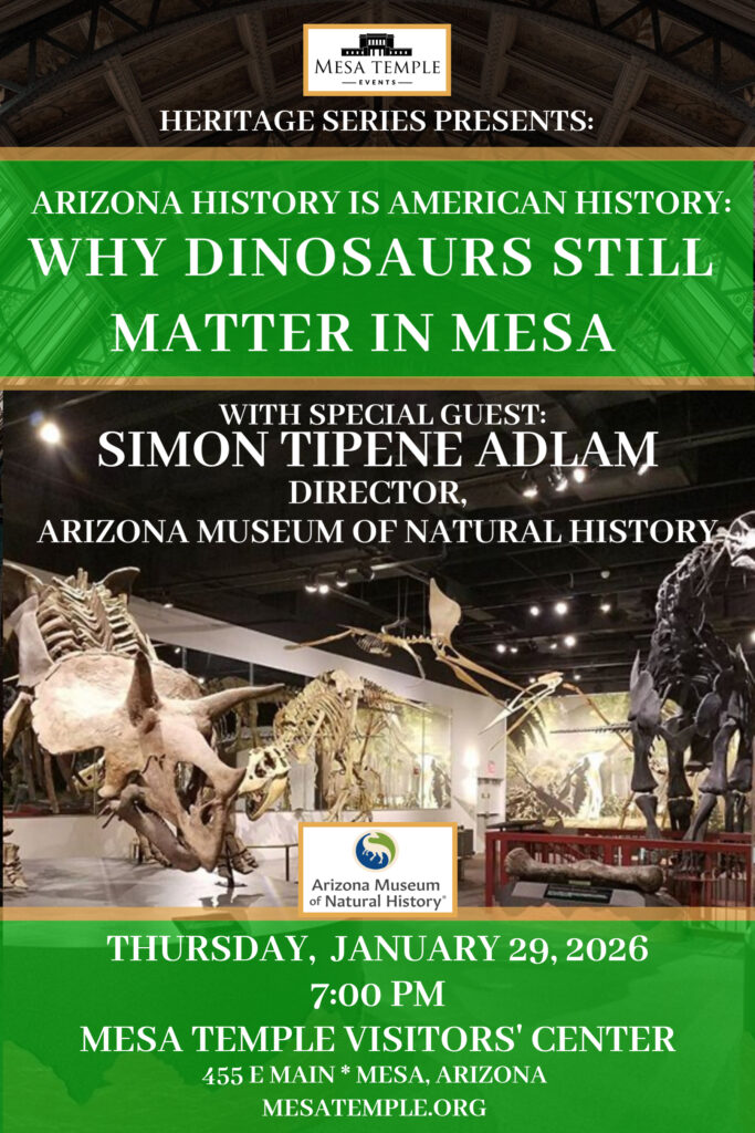 Join Simon Tipene Adlam, Director of the Arizona Museum of Natural History, for a dynamic presentation on how dinosaurs, deep time, and civic storytelling are shaping Mesa’s next century. From fossil beds to community futures, this talk explores why Arizona’s past—scientific, cultural, and spiritual—belongs at the heart of the American story.