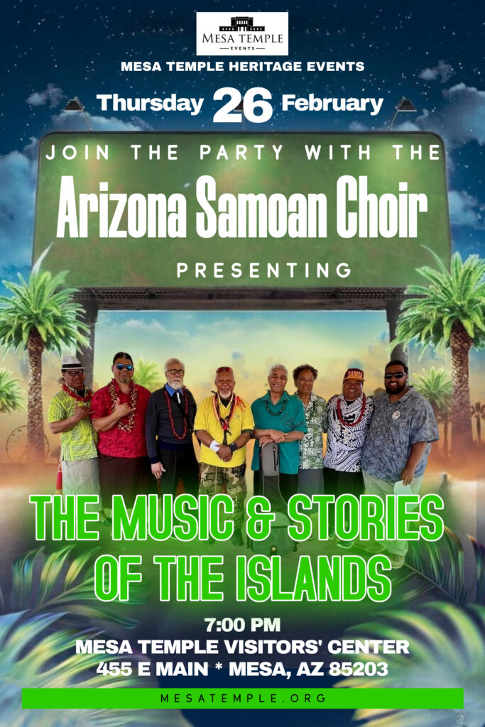Join in the fun of an evening of music with the Arizona Samoan Choir on Thursday, February 26, at 7:00 PM, at the Mesa Temple Visitors’ Center. This free event will focus on the songs and stories of the vibrant Polynesian culture.