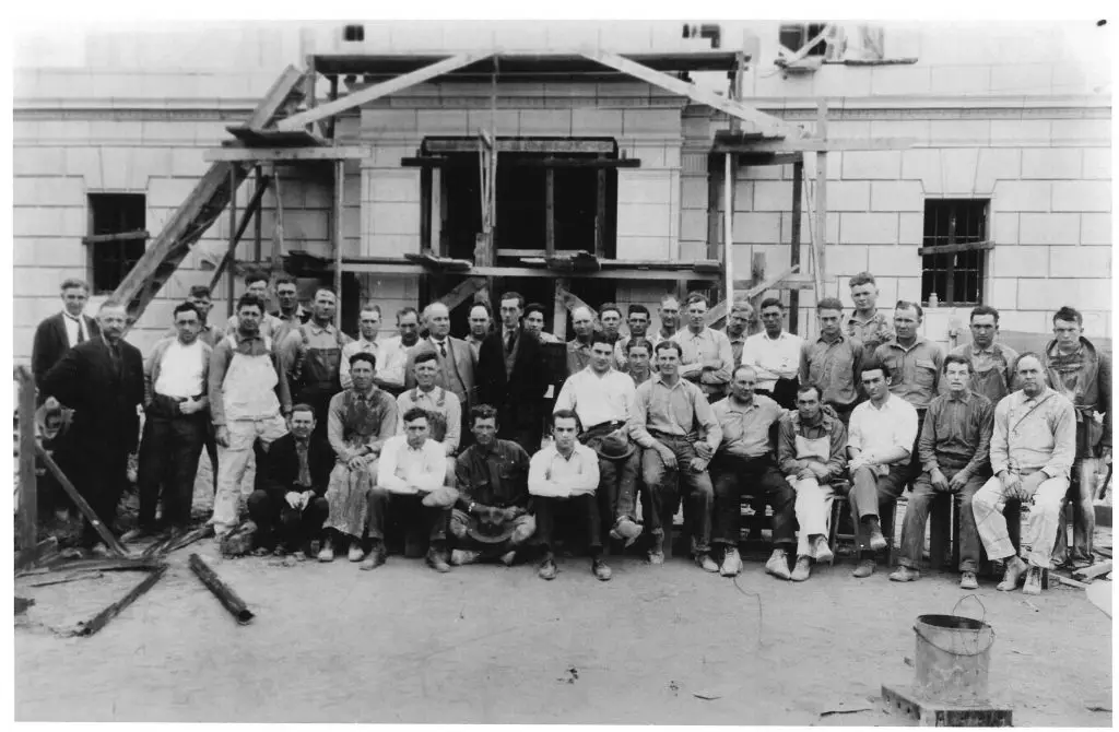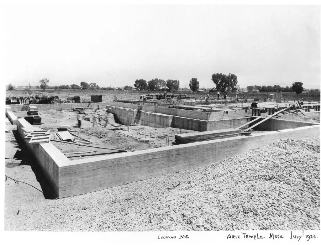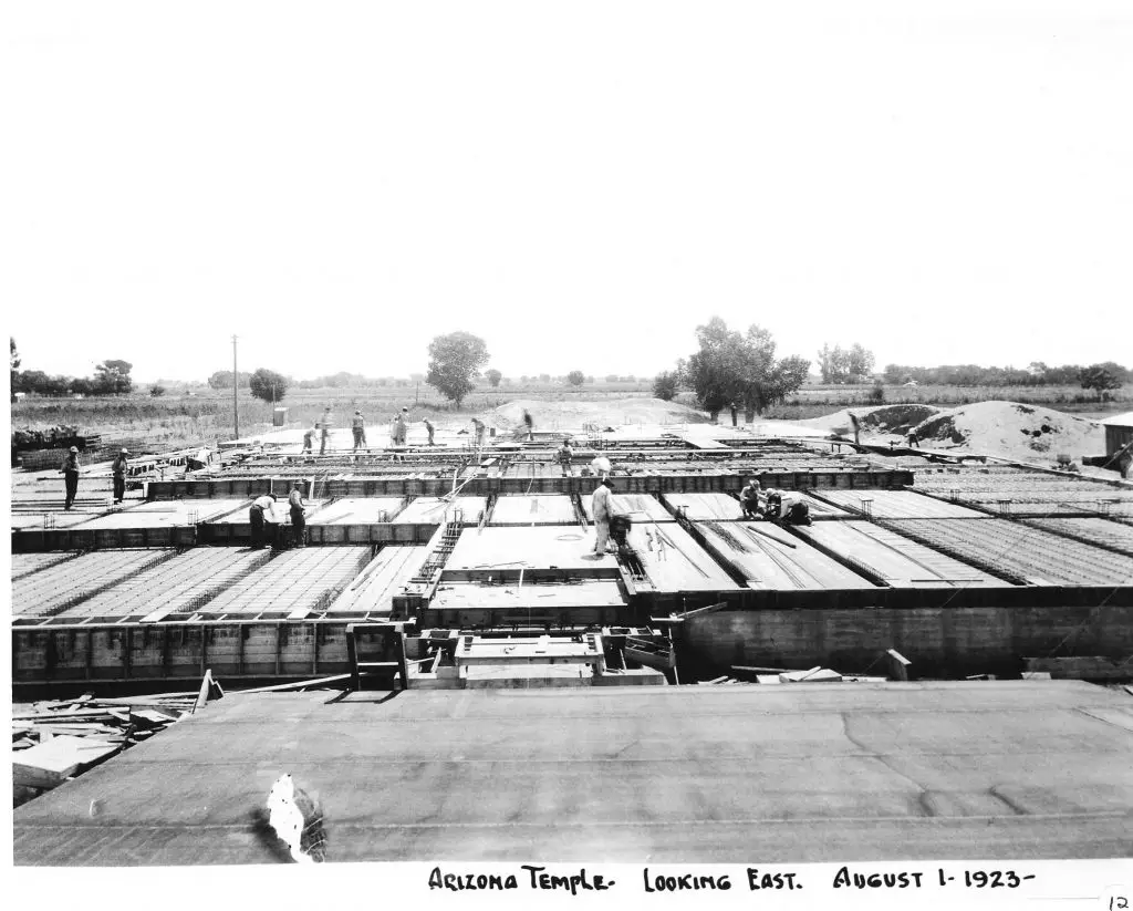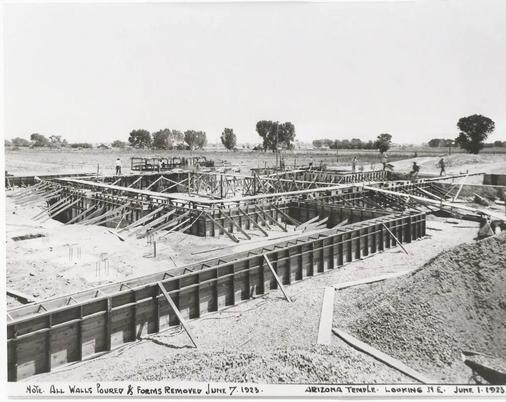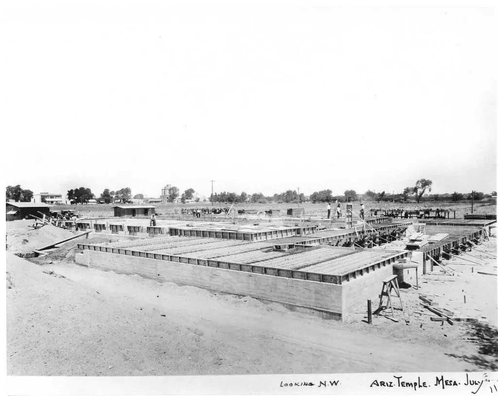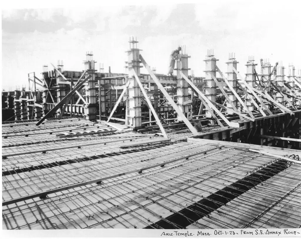 Under Brother Price’s direction, an office was erected to house tools and materials necessary for the temple’s construction. Twohy Brothers of Tempe provided the sand, and crushed rock was from the Tempe Butte quarry. The cement contract was given to the Foxworth-Bush Lumber Company from Riverside, California. Hardware was furnished from the O. S. Stapley Company in Mesa and 130 tons of steel were shipped in from El Paso, Texas.