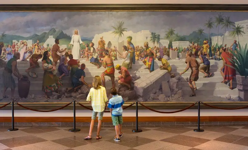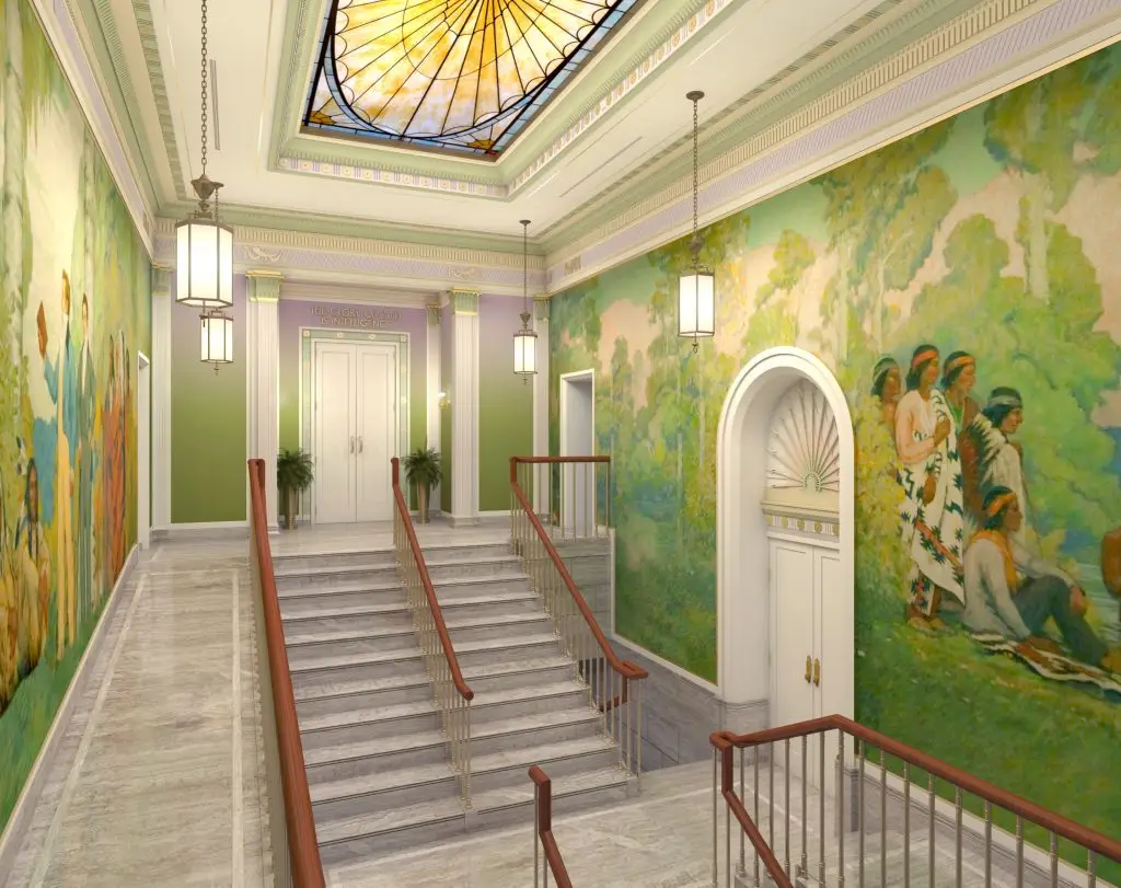 Los murales originales en la parte superior de la gran escalera fueron pintados por Lee Greene Richards y representan a José Smith predicando a los nativos americanos y el bautismo de los nativos americanos.