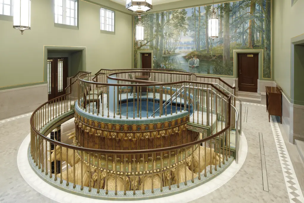 El baptisterio y la gran escalera cuentan con murales que son originales del templo. Estos murales fueron limpiados y reparados por Parma Conservation. Los murales del baptisterio fueron pintados por J. Leo Fairbanks con la ayuda de su padre y su hermano. Incluyen una representación del bautismo y la confirmación de José Smith y Oliver Cowdery en el río Susquehanna.