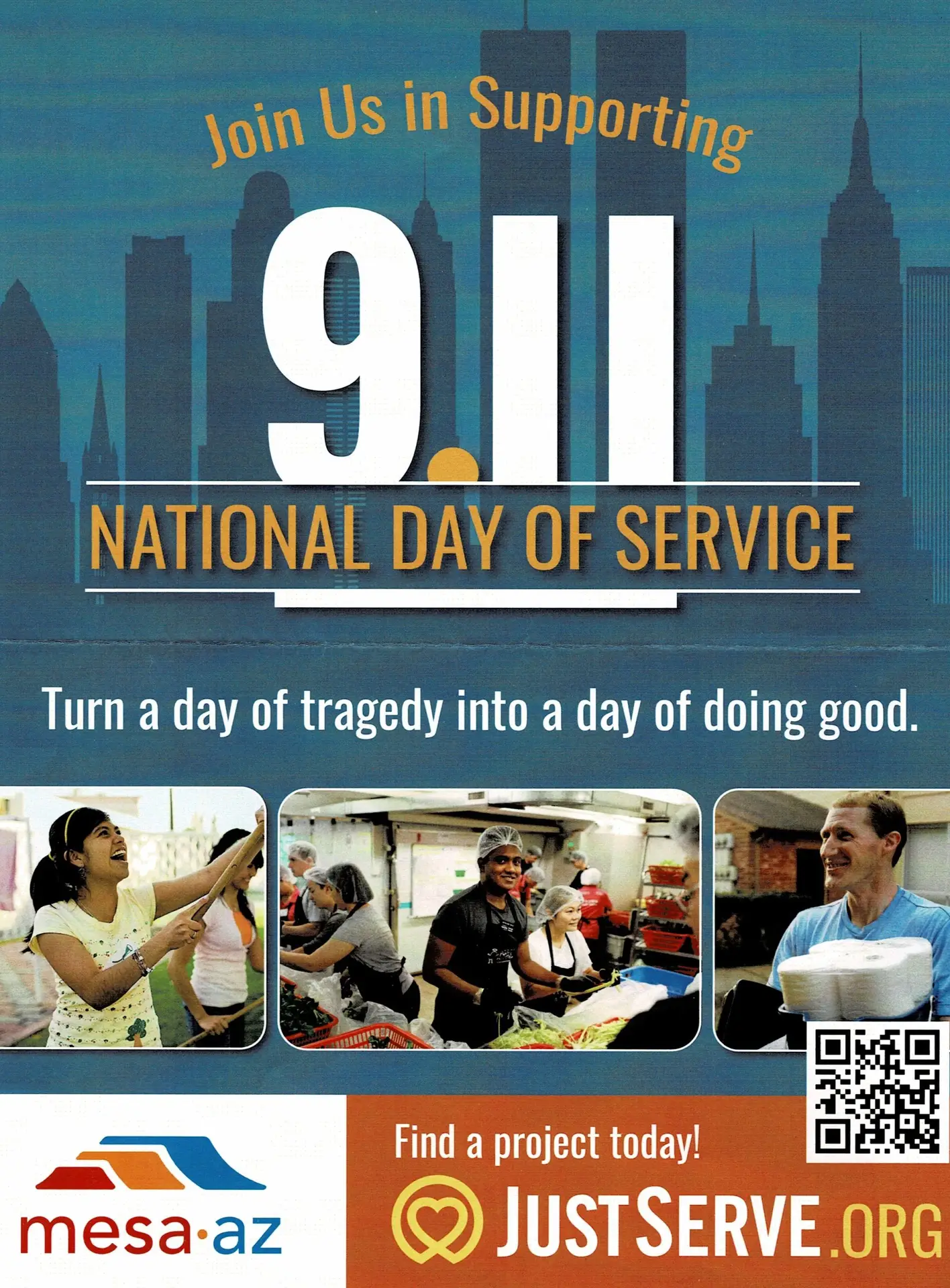 | In observance of September 11 National Day of Service, the city of Mesa is joining with JustServe.org to inspire volunteerism through many great service projects opportunities in Mesa. The nation changed forever on September 11, 2001. Many Americans remember a country before and a country after, and for many young Americans, only a country after. Terrorist attacks causing tragic loss of life at the World Trade Center in New York City, at the Pentagon in sight of the nation’s capital, and at a quiet field in southern Pennsylvania led to conversations and reflection on American identity, patriotism, security and selfless service that resonate even today. In 2009, Congress formally recognized the date as an annual “National Day of Service and Remembrance” — a time to honor the 9/11 victims and first responders through good works. Join with your community members to honor and commemorate the sacrifices made that fateful day by remembering the heroes, armed forces, first responders, and countless others’ acts of service to help their neighbors and defend our nation’s freedom. To get involved, find a local community project HERE |