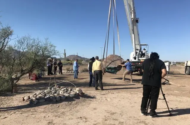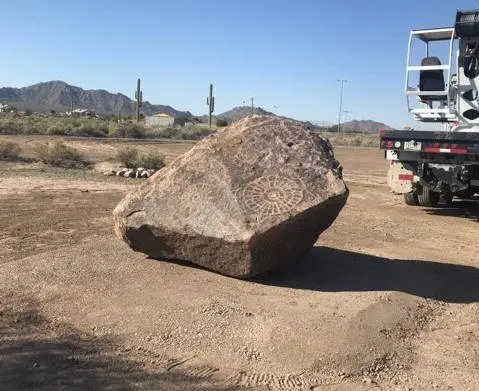 Roc Arnett, former director of the Metro Phoenix Public Affairs Council, contacted a representative of the tribe who said they would love to have the petroglyph back. Arrangements were made to load it onto a truck by crane, provided by Porter Bros. Construction, and haul it to the Gila River Indian Community, where it was placed on a mound of dirt near a community center on Nov. 9, 2018.