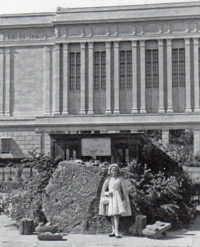 Early on, the rock was placed directly south of the temple along with some other artifacts including Native American grinding stones and small pieces of petrified wood. After the first visitors’ center was built and opened in 1956, the rock was moved to the north side of the temple, east of the reflecting pond between the temple and visitors’ center.