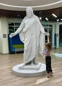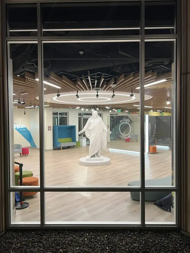 A similar Christus statue, which was once the focal point of the old Mesa Temple Visitors’ Center located north of the temple before the renovation from 2018 to 2021, has been installed as a permanent display in the new Visitors’ Center, located at 455 E. Main St. in downtown Mesa. The new statue is a more exact replica of the original, using laser measurements to reproduce it.