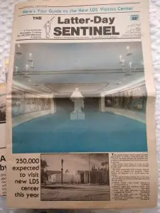 A 10-foot replica of the Christus statue was first introduced at the Visitors’ Center in 1981, when the original “Information Bureau,” which was built in 1956 on the north lawn of the temple grounds, was renovated and enlarged. Later, a sky background was added behind the statue.