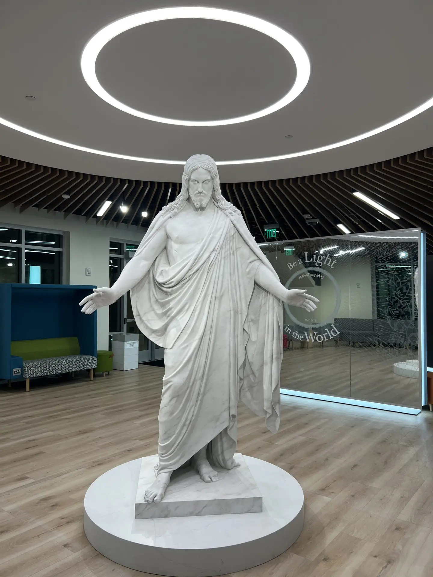 A similar Christus statue, which was once the focal point of the old Mesa Temple Visitors’ Center located north of the temple before the renovation from 2018 to 2021, has been installed as a permanent display in the new Visitors’ Center, located at 455 E. Main St. in downtown Mesa. The new statue is a more exact replica of the original, using laser measurements to reproduce it.