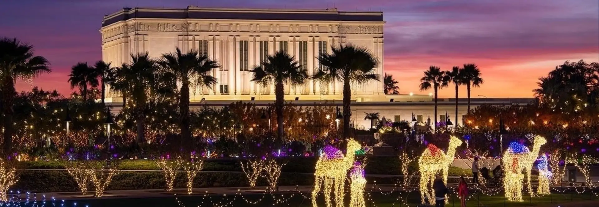 梅萨圣殿圣诞灯饰将于 2025 年回归,从 11 月 28 日星期五至 12 月 30 日星期二,每天晚上 5:00 至 10:00 亮灯。.